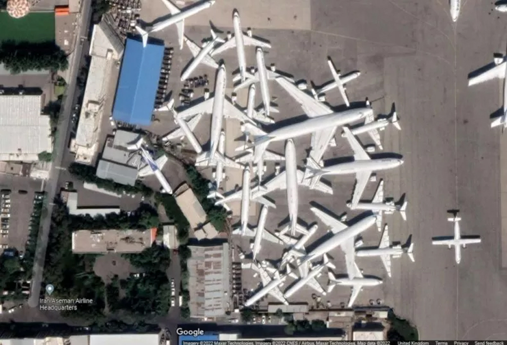 الصورة مأخوذة من خرائط Google لعام 2022، بواسطة شركة Maxar Technologies، وتُظهر ما لا يقل عن 20 طائرة بأحجام مختلفة مصطفة في المطار الدولي.
